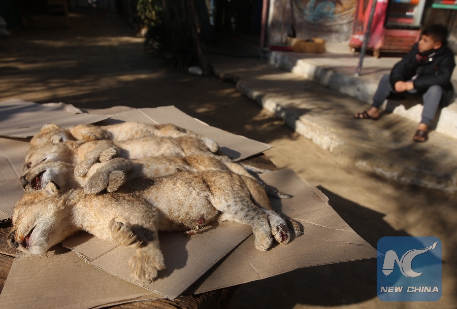 Bodies of four new-born lion cubs that died in a zoo are seen in the southern Gaza Strip city of Rafah, on Jan. 18, 2019. A severe cold wave swept the region recently and claimed the lives of the cubs. (Xinhua/Khaled Omar)