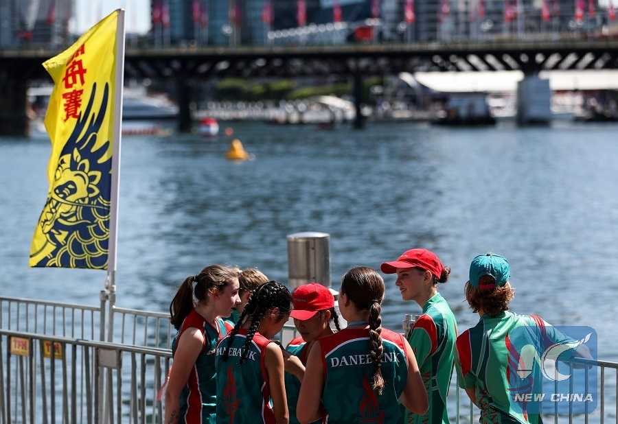 Members of local dragon boat club gather ahead of a dragon boat race at Darling Harbor, Sydney, Australia, Feb. 9, 2019. (Xinhua/Bai Xuefei)