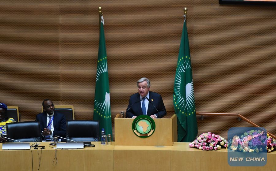 United Nations Secretary-General Antonio Guterres delivers a speech at the 32ndAfrican Union (AU) summit of heads of state and government in Addis Ababa, Ethiopia, on Feb. 10, 2019. (Xinhua/Li Yan)