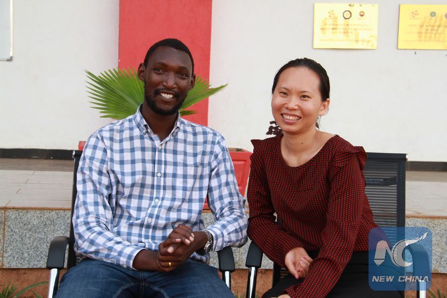 Cathy Gong (R) and Blaise Armand Nzojiyobiri sit and share their love stories in Kampala, Uganda, Feb. 12, 2019. (Xinhua/Zhang Gaiping)