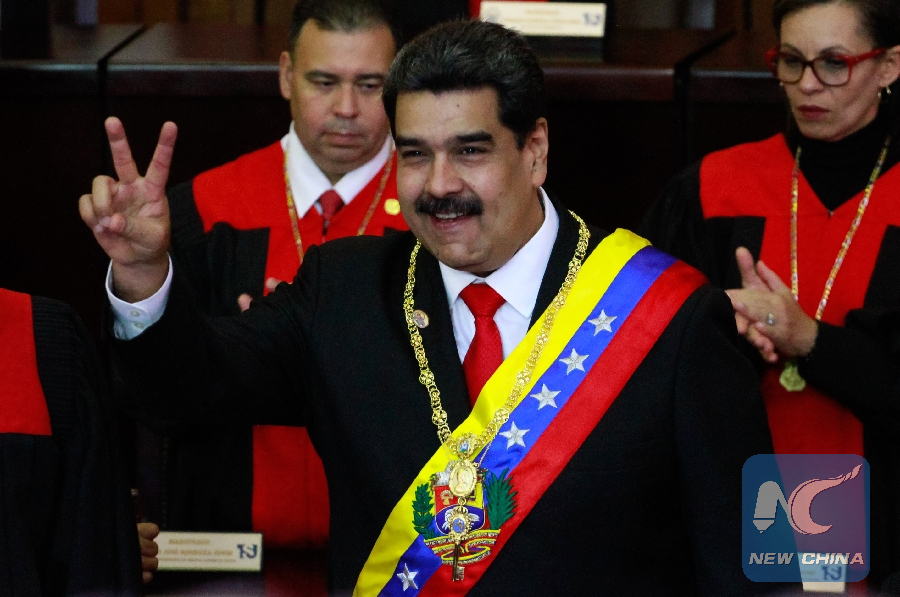 File Photo: Venezuelan President Nicolas Maduro (C) gestures during the presidential inauguration ceremony in Caracas, Venezuela, on Jan. 10, 2019. Nicolas Maduro was sworn in before the Supreme Court of Justice to begin a new six-year term. (Xinhua/Andrea Romero)