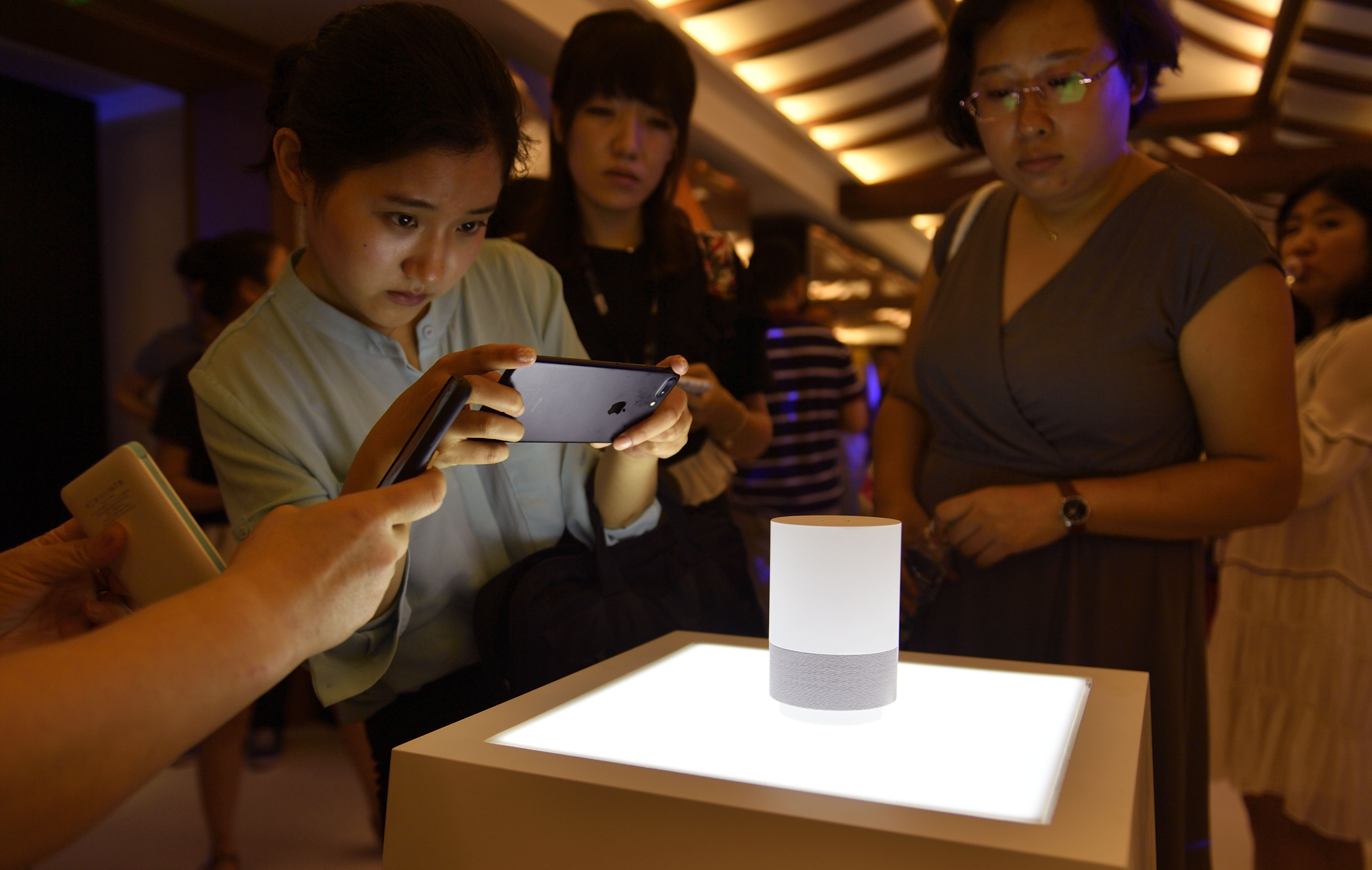 People take photo of Alibaba's smart speaker, the Tmall Genie, when it is unveiled in Beijing, July 5, 2017. (Xinhua)
