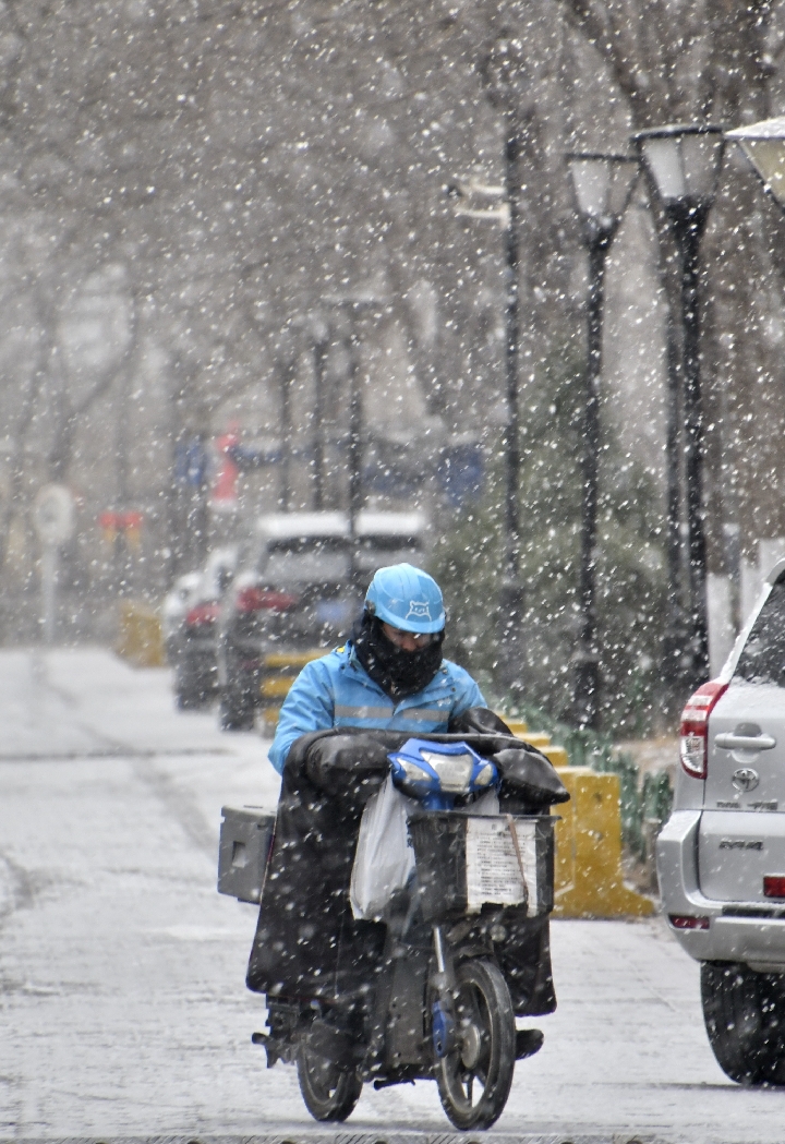 A delivery man rides in snow in Daxing District, Beijing on Feb. 12, 2019. (Xinhua/Li Xin)