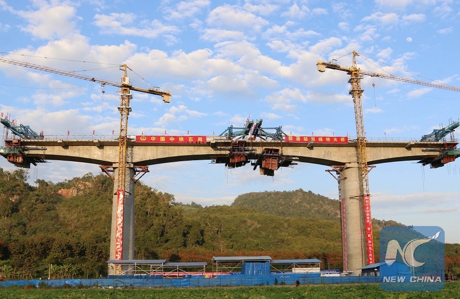 Constructors work at the site of the first cast-in-place continuous beam of the China-Laos railway at the under-construction Nathon Station Double-track Super Major Bridge, some 360 km north of Vientiane, capital of Laos, Jan. 18, 2019. (Xinhua/Huang Zongwen)