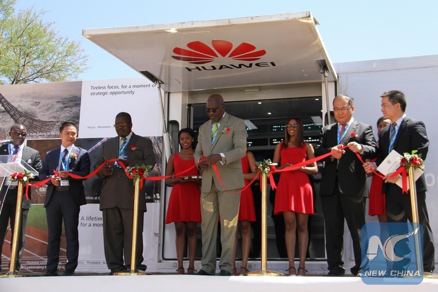 Namibian Information and Communication Technology (ICT) Minister Tjekero Tweya (C) cuts a ribbon for Huawei Demo Truck during the National ICT summit 2016 in Windhoek, capital of Namibia, Oct. 10, 2016. The Ministry of Information and Communication Technology (MICT) and the Huawei Telecommunication Technologies Namibia on Monday signed a Memorandum of Understanding (MoU) to promote ICT literacy. (Xinhua/Wu Changwei)