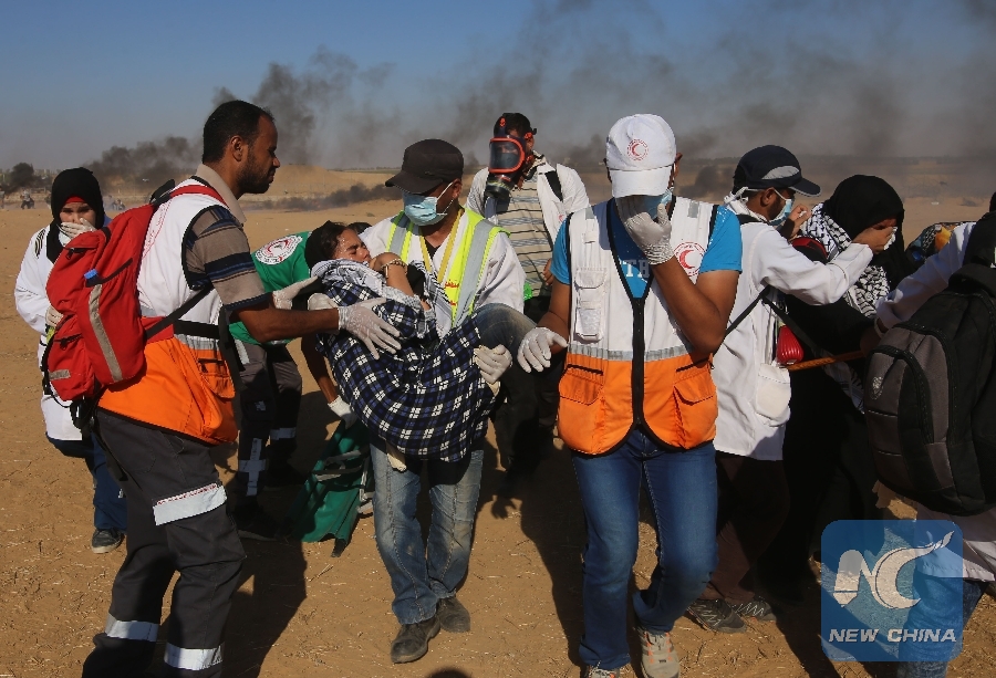 Medical staff carry an injured girl during clashes on Gaza-Israel border, east of the southern Gaza Strip City of Khan Younis, on Aug. 17, 2018. (Xinhua File photo)