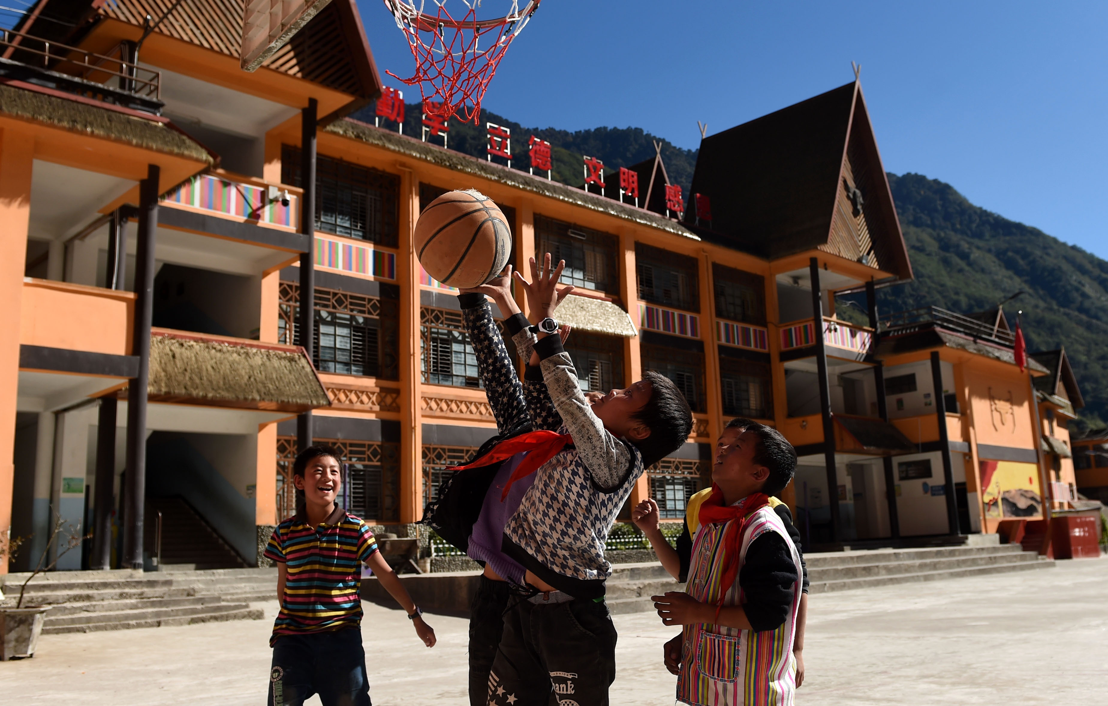 Students play basketball at a primary school at Gongshan Dulong and Nu Autonomous County of Lisu Autonomous Prefecture of Nujiang, southwest China's Yunnan Province, Nov. 23, 2016. (Xinhua/Lin Yiguang)