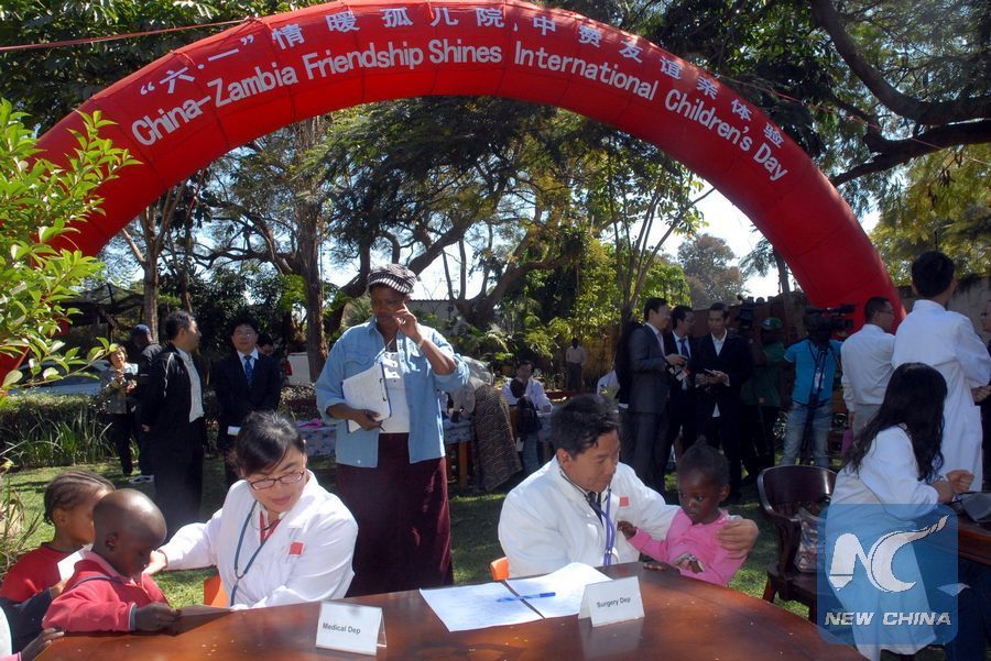 Chinese doctors take medical examination of children at a orphanage in Lusaka, capital of Zambia, June 1, 2013. In a move aiming at promoting China-Zambia friendship, three Zambia-based Chinese organizations -- the Confucius Institute, Chinese medical team and Sino-Hydro Zambia Limited on Saturday got together with children of the Kabwata Orphanage in Lusaka during celebrations to mark the International Children's Day. (Xinhua/Kris Moonga)