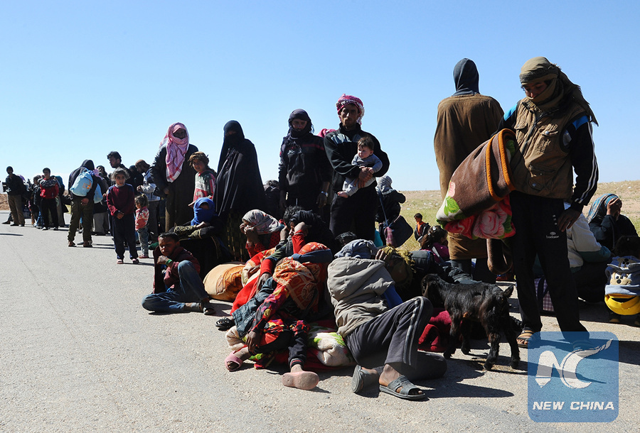 Syrian refugees are seen at the Jlaighem crossing after they left the Rukban camp, in the eastern countryside of Homs Province, Syria, on May 8, 2019. (Xinhua/Ammar Safarjalani)