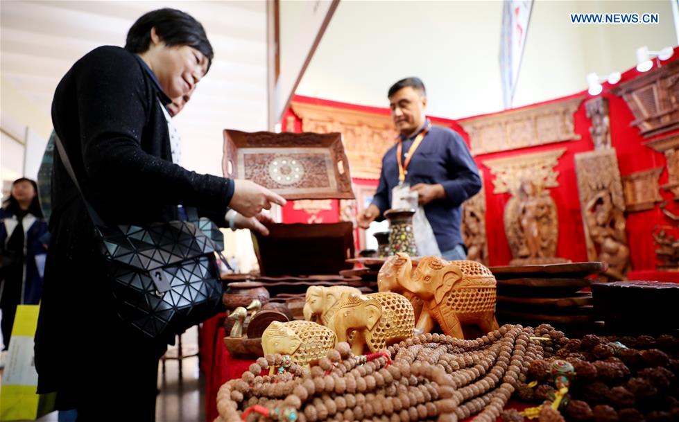 Visitors view wood-carving products from Nepal in Shanghai, east China, May 31, 2019. The Belt and Road Brand Expo 2019 kicked off at Shanghai Exhibition Center in Shanghai Friday. (Xinhua/Fang Zhe)