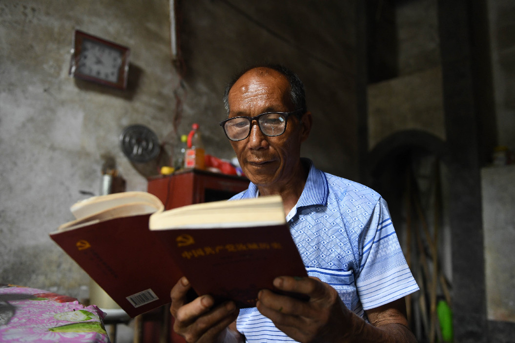 Villager Xie Nanjing reads a book at home in Shihan Village, Kuantian Town, Yudu County, east China's Jiangxi Province, June 13, 2019. (Xinhua/Zhou Mi)