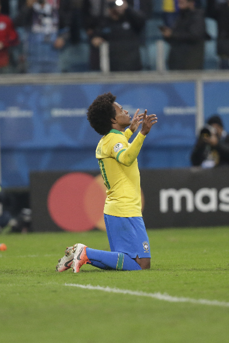 Brazil's Willian celebrates after scoring during the Copa America 2019 quarterfinal match between Brazil and Paraguay in Porto Alegre, Brazil, on June 27, 2019. (Xinhua/Francisco Canedo)