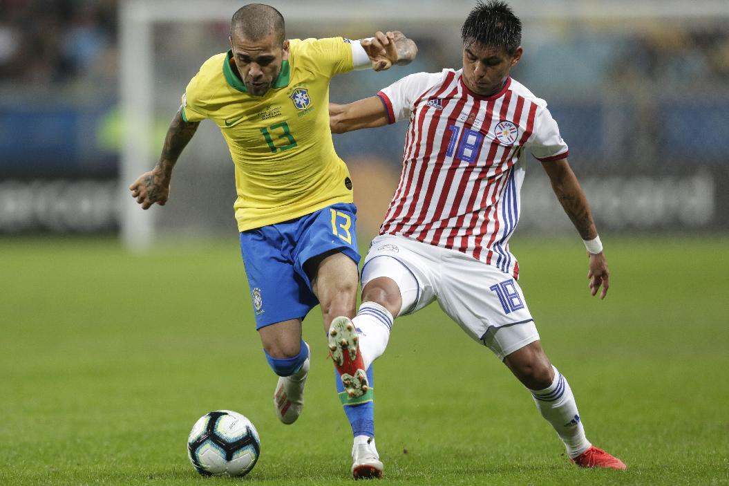 Brazil's Dani Alves (L) vies with Santiago Arzamendia of Paraguay during the Copa America 2019 quarterfinal match between Brazil and Paraguay in Porto Alegre, Brazil, on June 27, 2019. (Xinhua/Francisco Canedo)