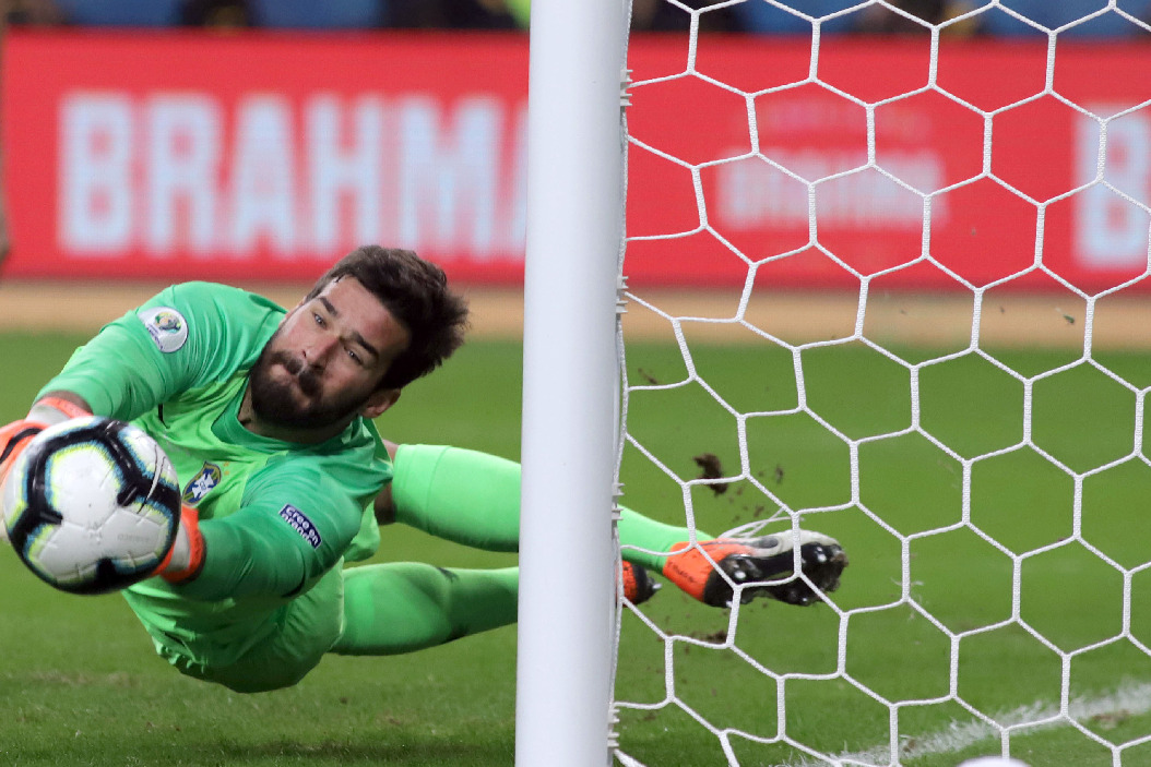 Brazil's goalkeeper Alisson saves the penalty in the penalty shootout during the Copa America 2019 quarterfinal match between Brazil and Paraguay in Porto Alegre, Brazil, on June 27, 2019. (Xinhua/Francisco Canedo)