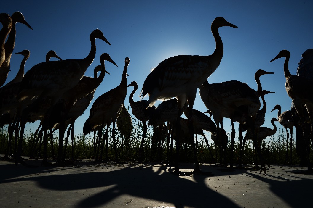 Red-crowned cranes are seen at Zhalong National Nature Reserve in Qiqihar, northeast China's Heilongjiang Province, Aug. 1, 2018. (Xinhua/Meng Chenguang)