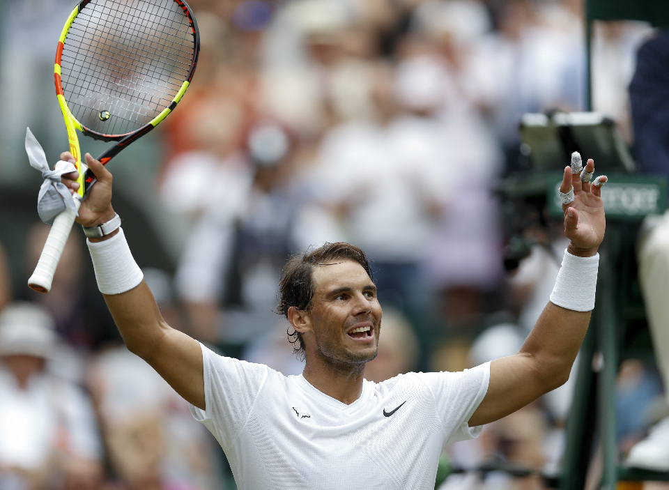 Rafael Nadal of Spain celebrates after winning the men's singles third round match over Jo-Wilfried Tsonga of France at the 2019 Wimbledon Tennis Championships in London, Britain, on July 6, 2019. (Xinhua/Han Yan)