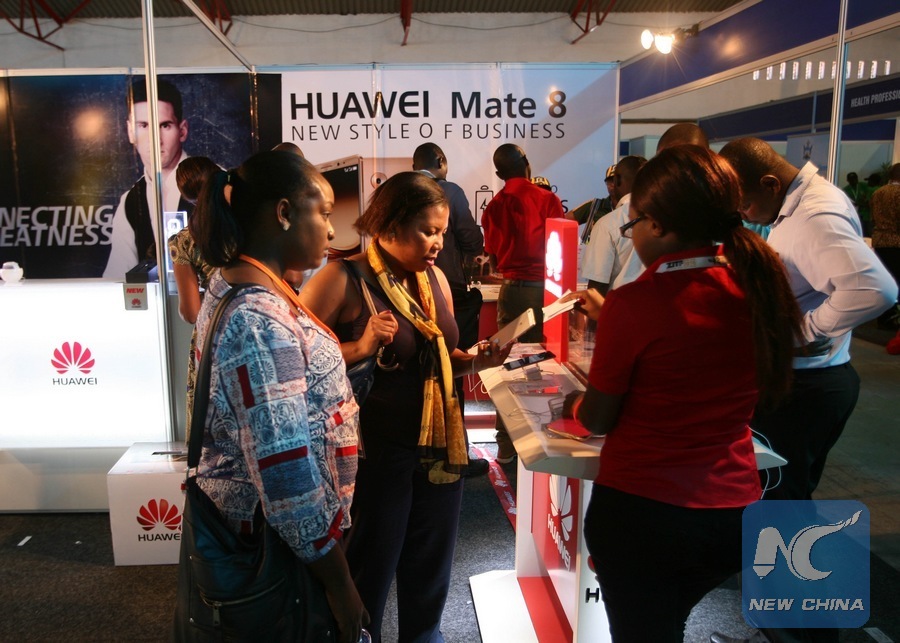 Residents of Zimbabwe gather at a booth set up by Chinese tech firm Huawei during the 57th Zimbabwe International Trade Fair (ZITF) in Bulawayo, Zimbabwe, April 28, 2016. (Xinhua/Stringer)