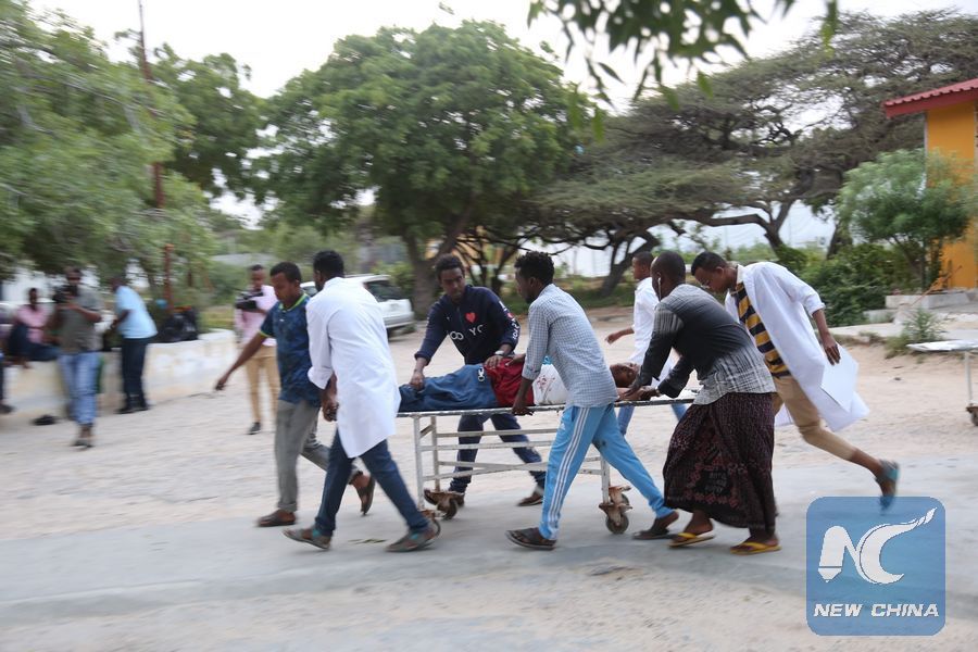 People carry a wounded person on a stretcher after a suicide attack at Mogadishumayor's offices in Mogadishu, Somalia, July 24, 2019. Mogadishu mayor, Abdirrahman Omar Osman was injured while a district commissioner was killed when two suicide bombers blew themselves up at Banadir administration headquarters which houses the mayor offices on Wednesday. (Xinhua/Hassan Bashi)