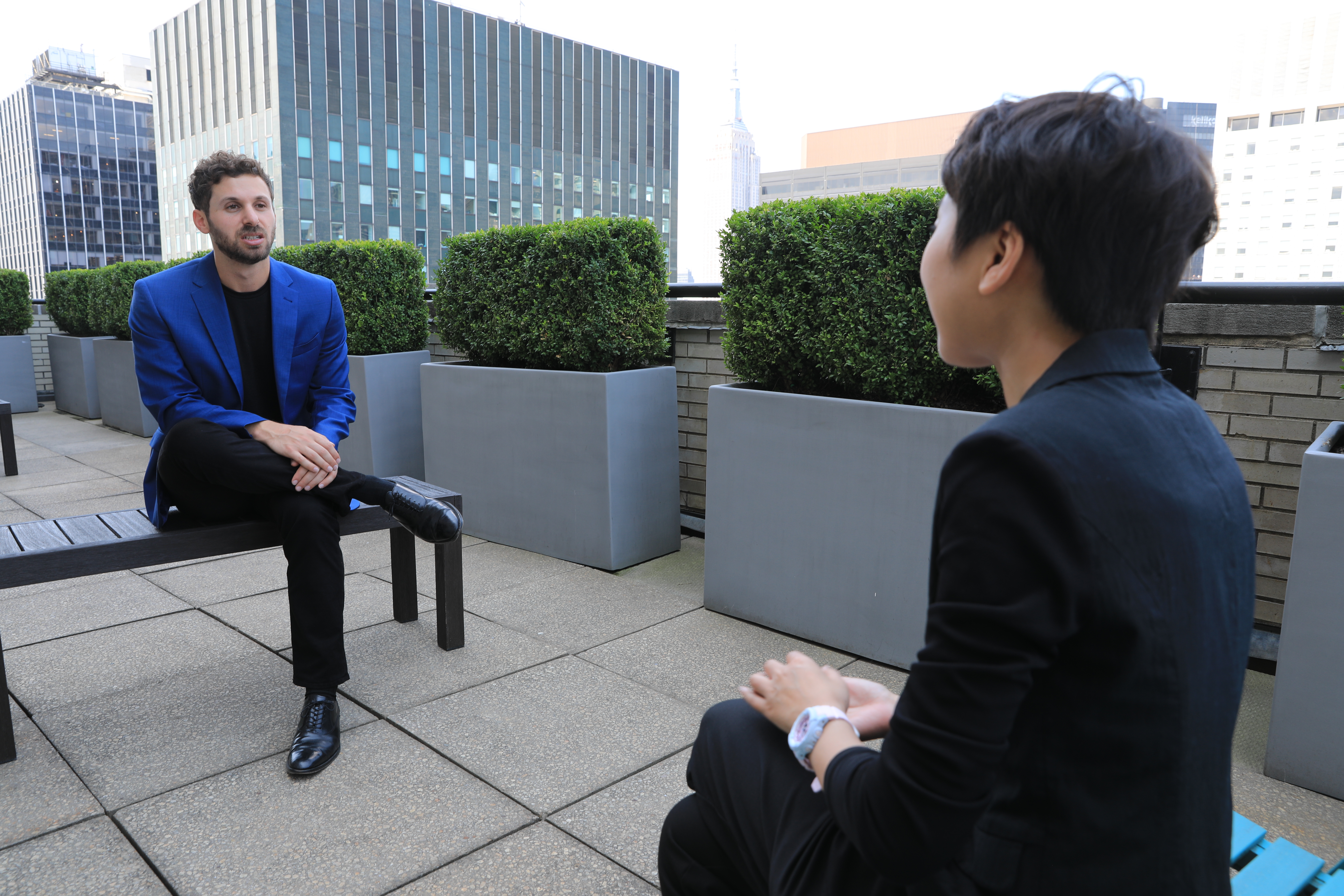 Zak Dychtwald receives an interview with Xinhua in midtown Manhattan of New York, the United States, July 26, 2019. (Xinhua/Zhang Mocheng)