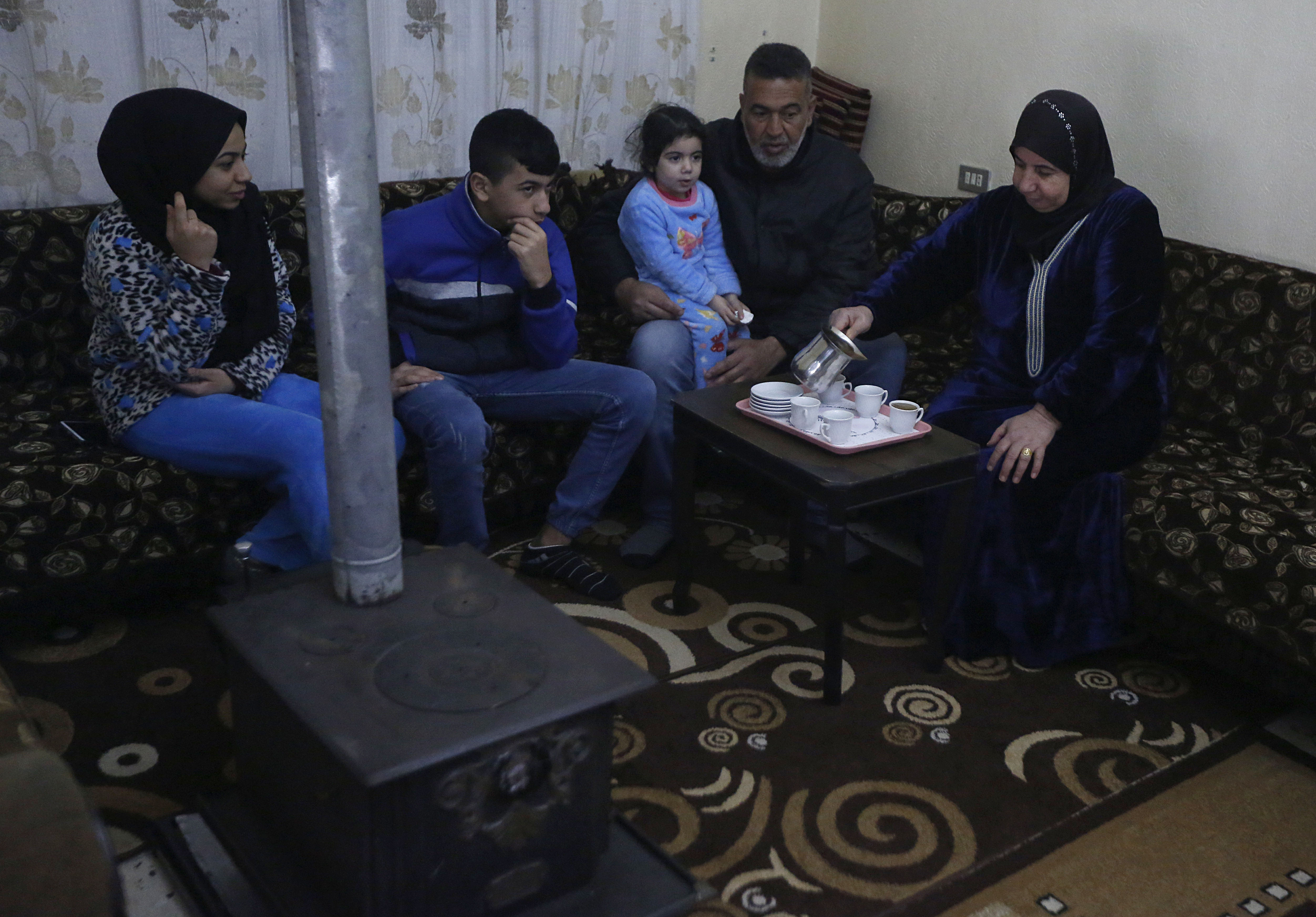 The family of Ahmad Abbas, a refugee in his 60s who came from Baba Amr in Homs in central Syria, sit together in a rented apartment in Ketermaya, southeast of Beirut, Lebanon, March 8, 2019. (Xinhua/Bilal Jawich)