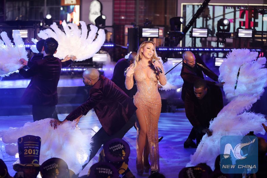 Singer Mariah Carey (C) performs during the New Year celebration at Times Square in New York, the United States, Dec. 31, 2016. (Xinhua/Wang Ying)
