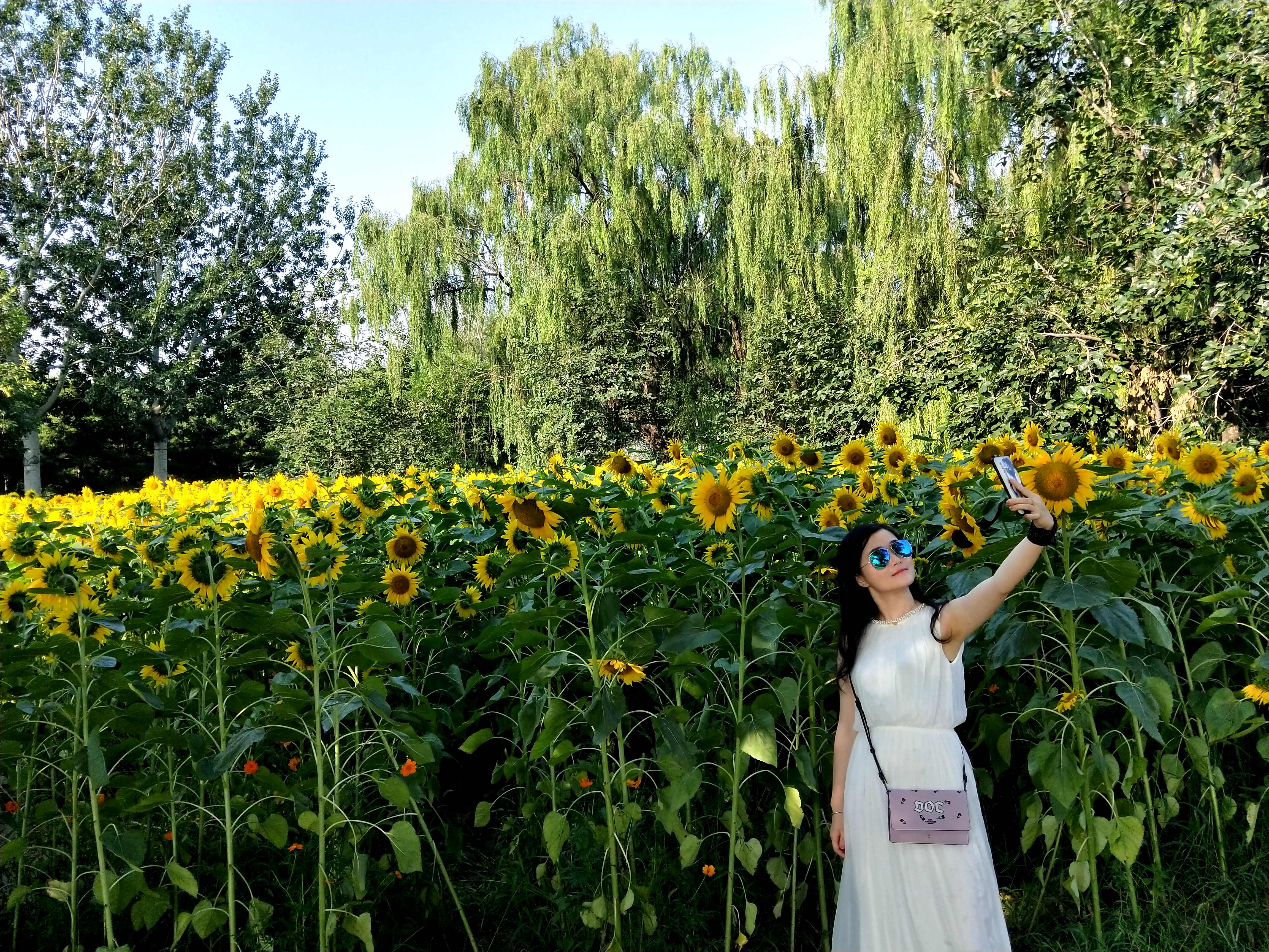 Mobile photo shows a woman taking selfie with sunflowers at Beijing Olympic Forest Park in Beijing, capital of China, July 14, 2019. (Xinhua/Wei Mengjia)
