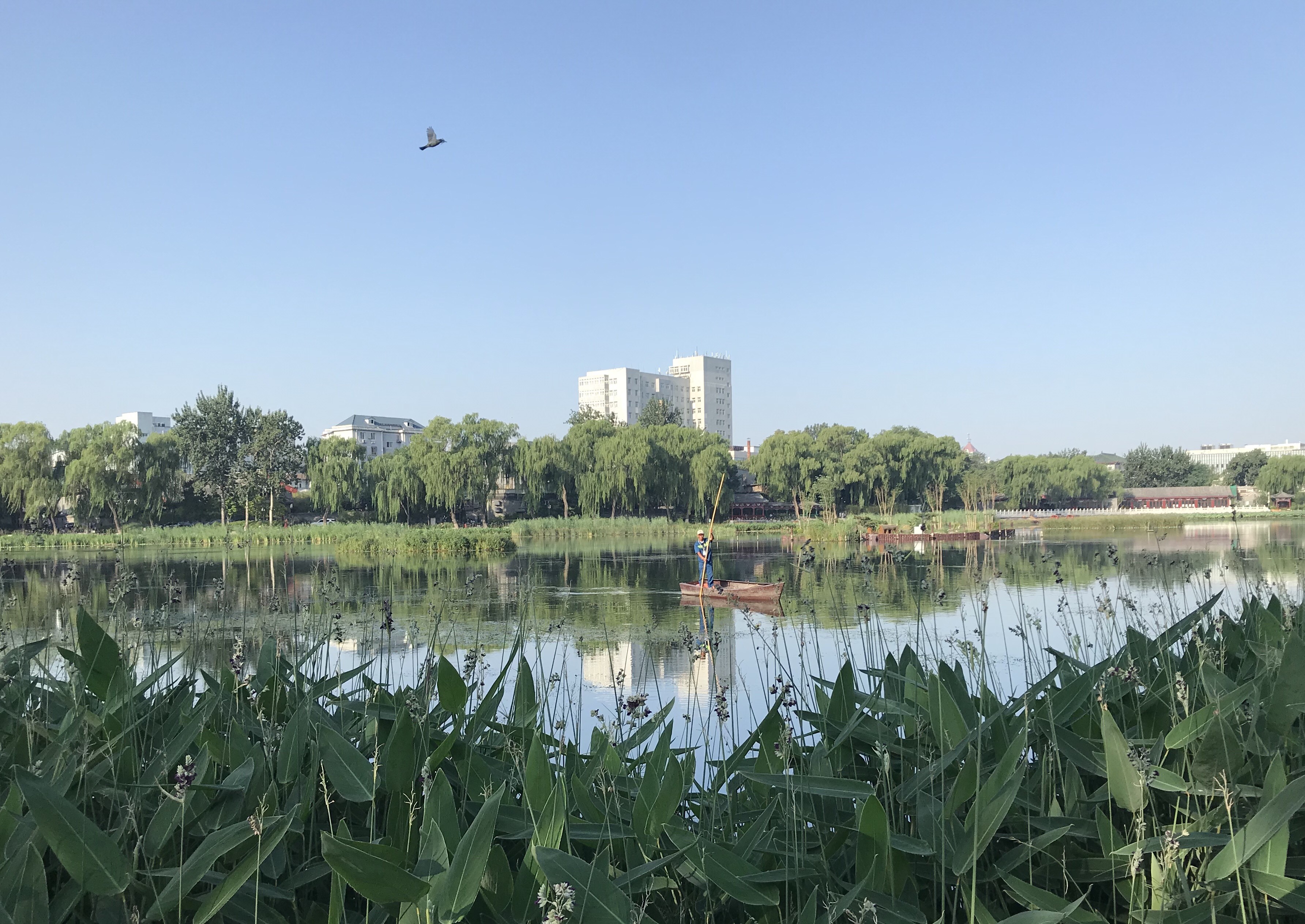 Mobile photo shows a man punting in Xihai Wetland Park in Beijing, capital of China, July 31, 2019. (Xinhua/Ding Hongfa)