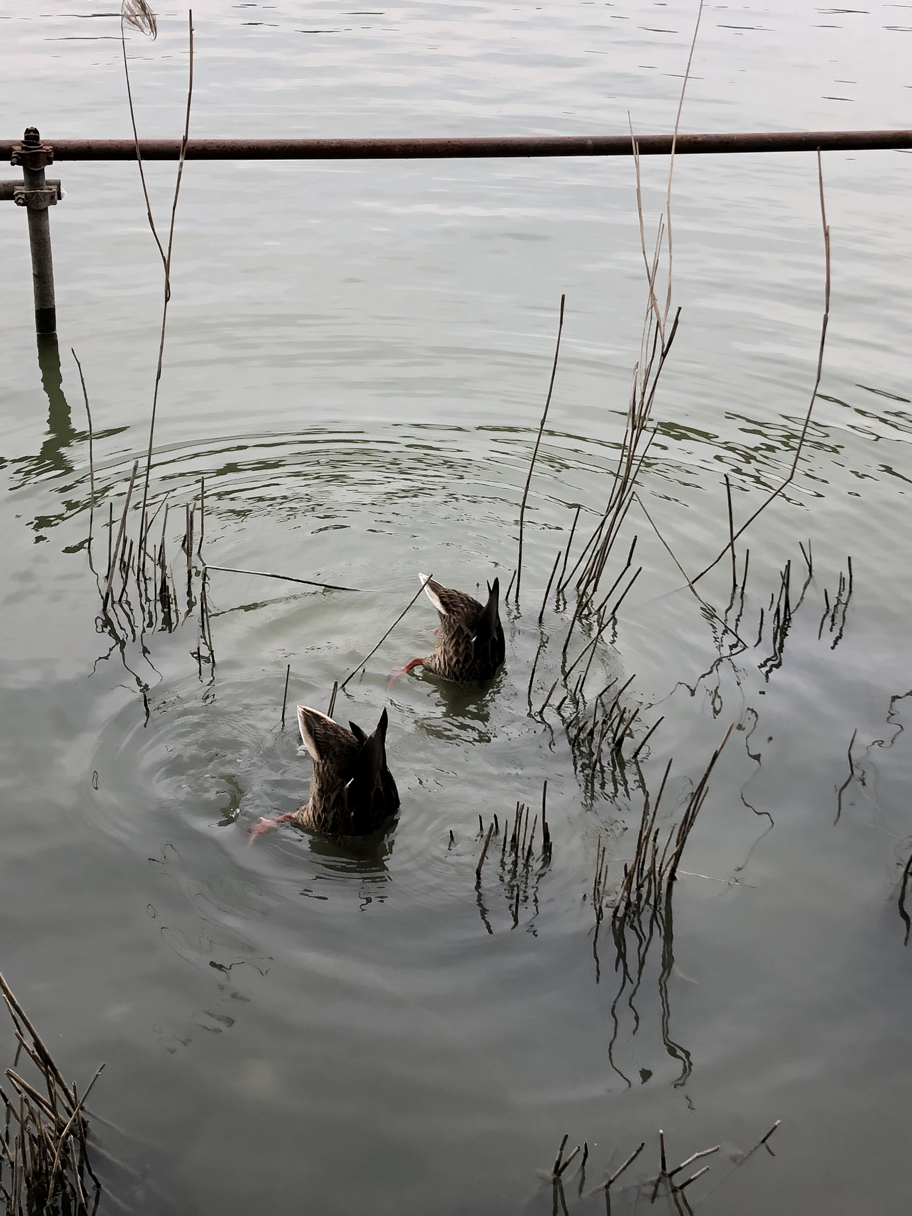 Mobile photo shows two ducks seeking food on the lake at Yuyuantan Park in Beijing, capital of China, June 8, 2019. (Xinhua/Li Yahui)