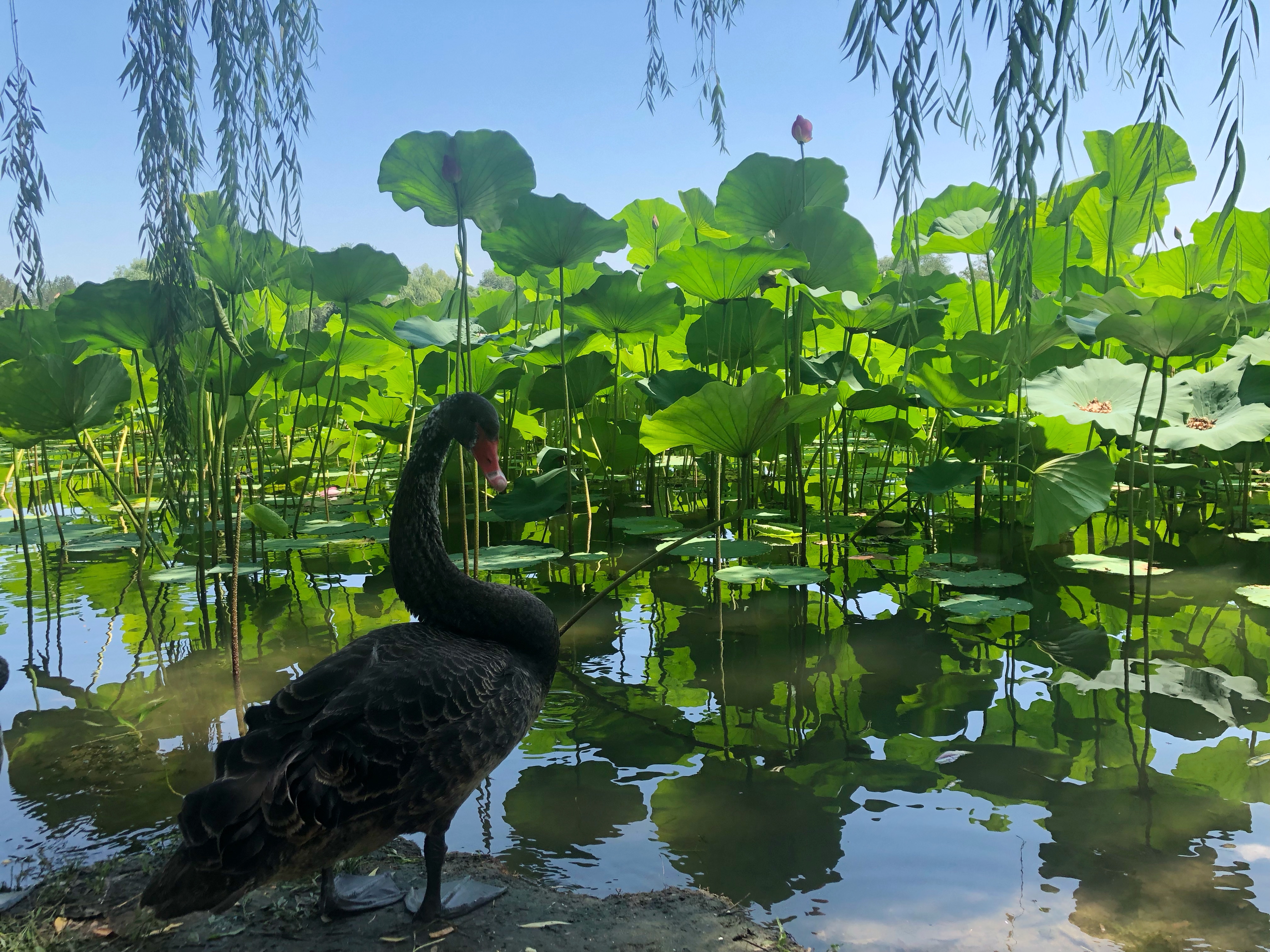 Mobile photo shows a black swan standing by a lake in Yuanmingyuan, or the Old Summer Palace, in Beijing, capital of China, on July 14, 2019. (Xinhua/Zhang Xinjing)