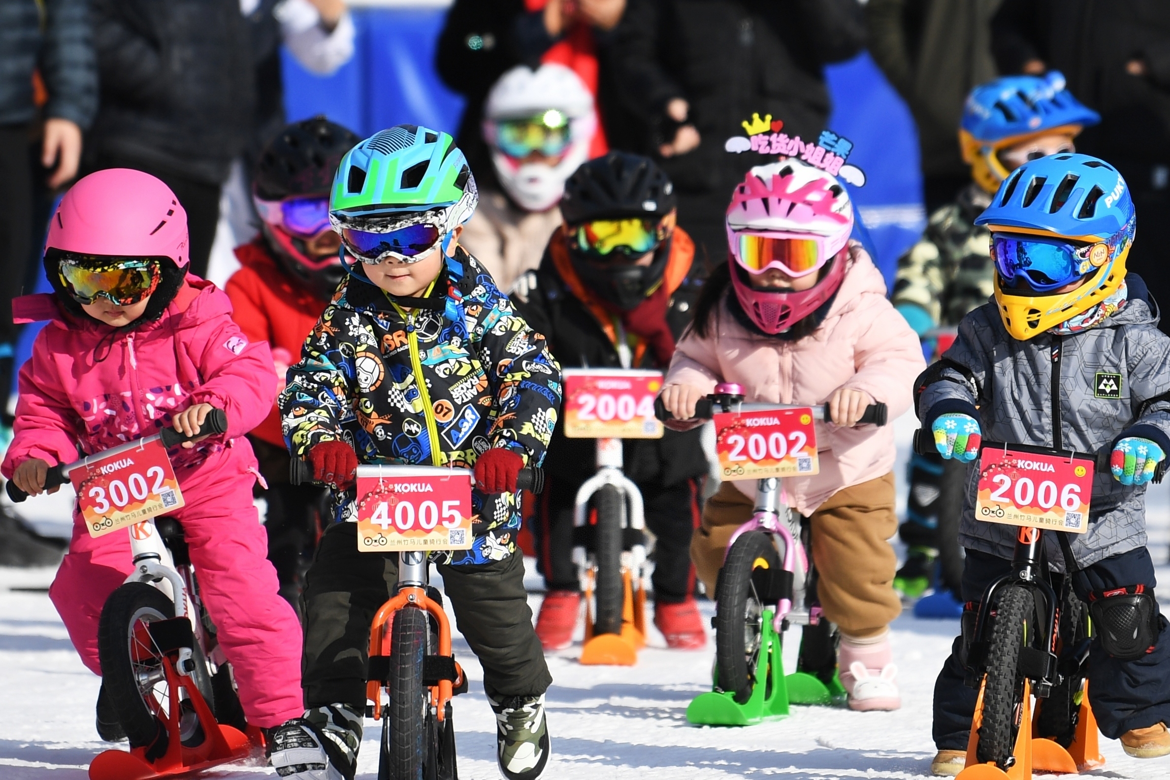 Children take part in the balance bike competition on the snow in Yongjing County, northwest China's Gansu Province, on Jan. 12, 2019. (Xinhua/Chen Bin)