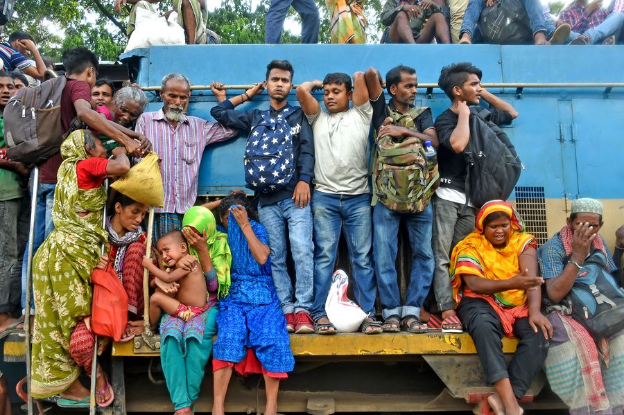 Passengers are seen on an overcrowded train ahead of the Eid al-Adha holiday in Dhaka, capital of Bangladesh, on Aug. 9, 2019. (Str/Xinhua)
