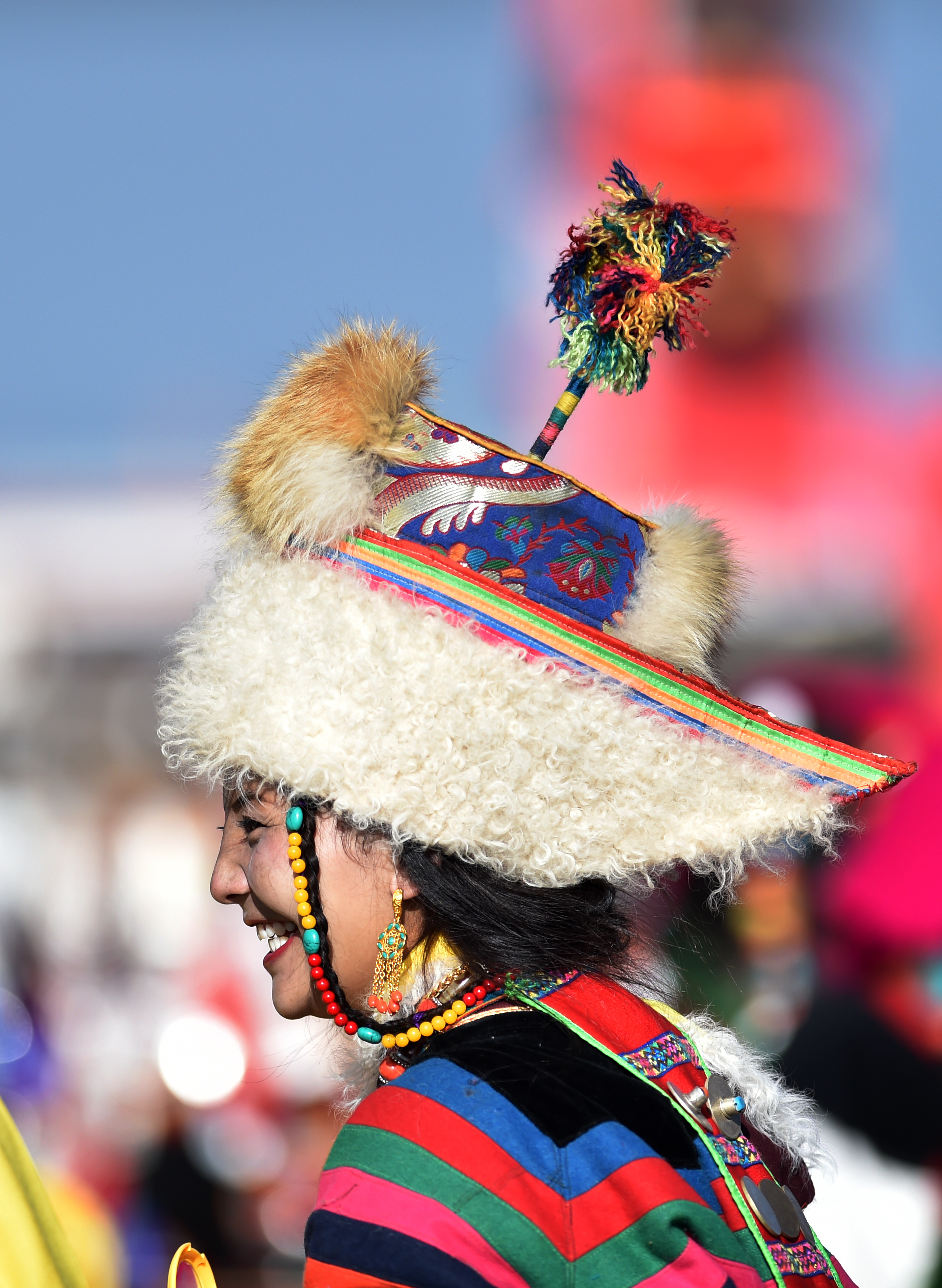 A woman wearing a hat is seen during a horse racing festival in Nagqu City, southwest China's Tibet Autonomous Region. (Xinhua/Chogo)