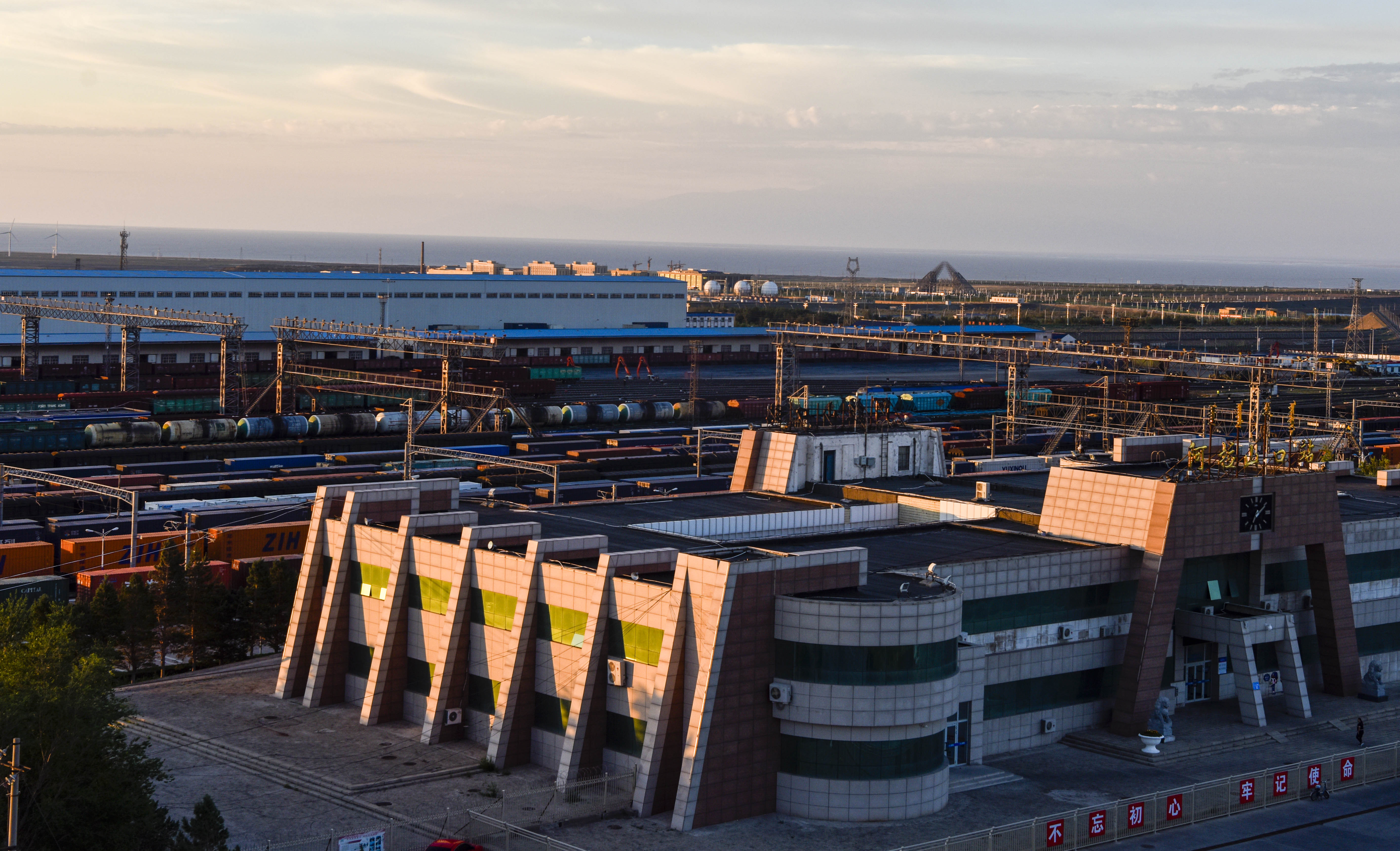 Photo taken on July 5, 2018 shows a morning view of the Alataw Pass Station in northwest China's Xinjiang Uygur Autonomous Region. China-Europe freight trains run through the pass at the China-Kazakhstan border every day. (Xinhua/Zhao Ge)