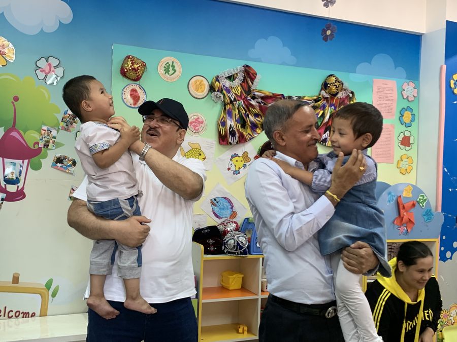 Bahraini Ambassador to China Anwar Alabdulla (2nd L) and Nepalese Ambassador to China Leela Mani Paudyal interact with local children at Guyuanxiang community in Urumqi, capital city of northwest China's Xinjiang Uygur Autonomous Region, Aug. 19, 2019. (Xinhua/Sun Shaoxiong)