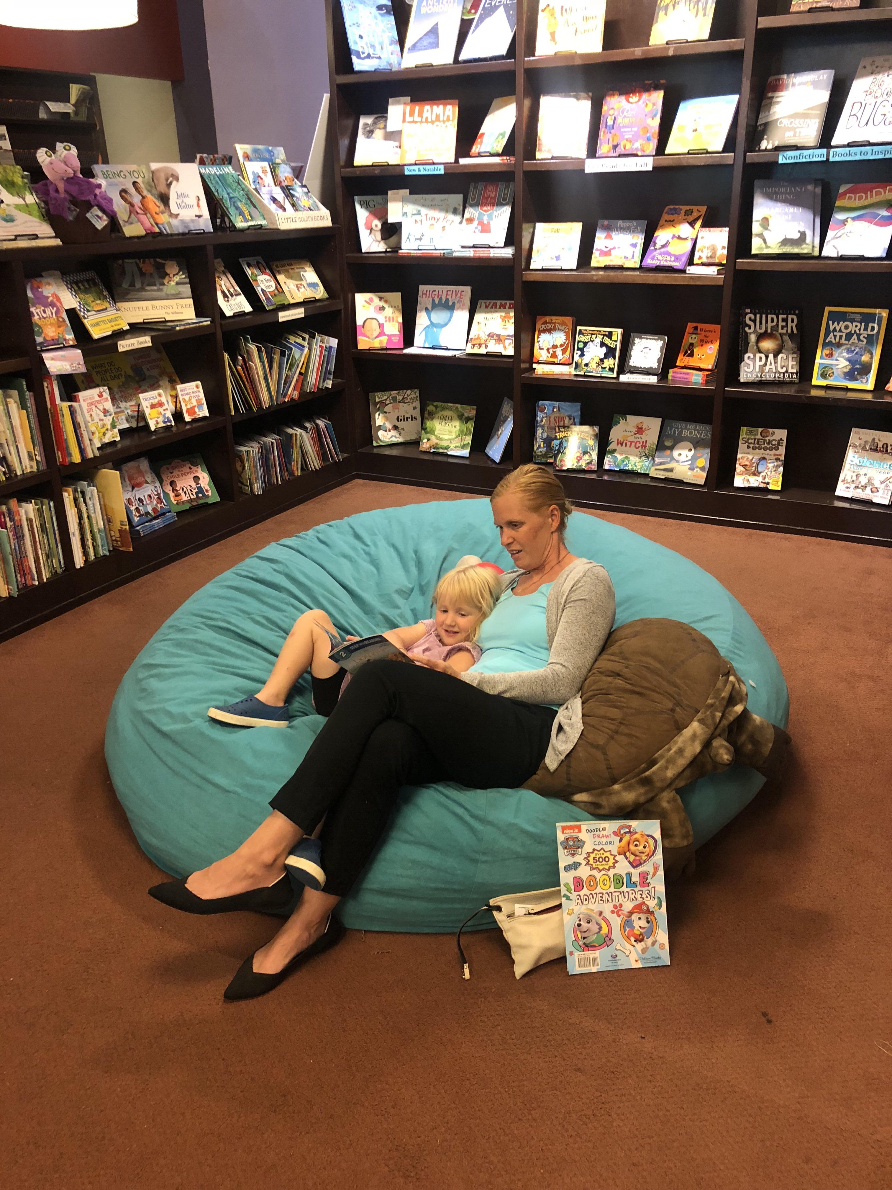 Fiocco's 15-person bookstore is located in Chapel Hill, North Carolina, with a vibrant, diverse children's book section. A blue bean bag sofa with a few toys makes it attractive for kids, who would sit comfortably with their parents to read books.