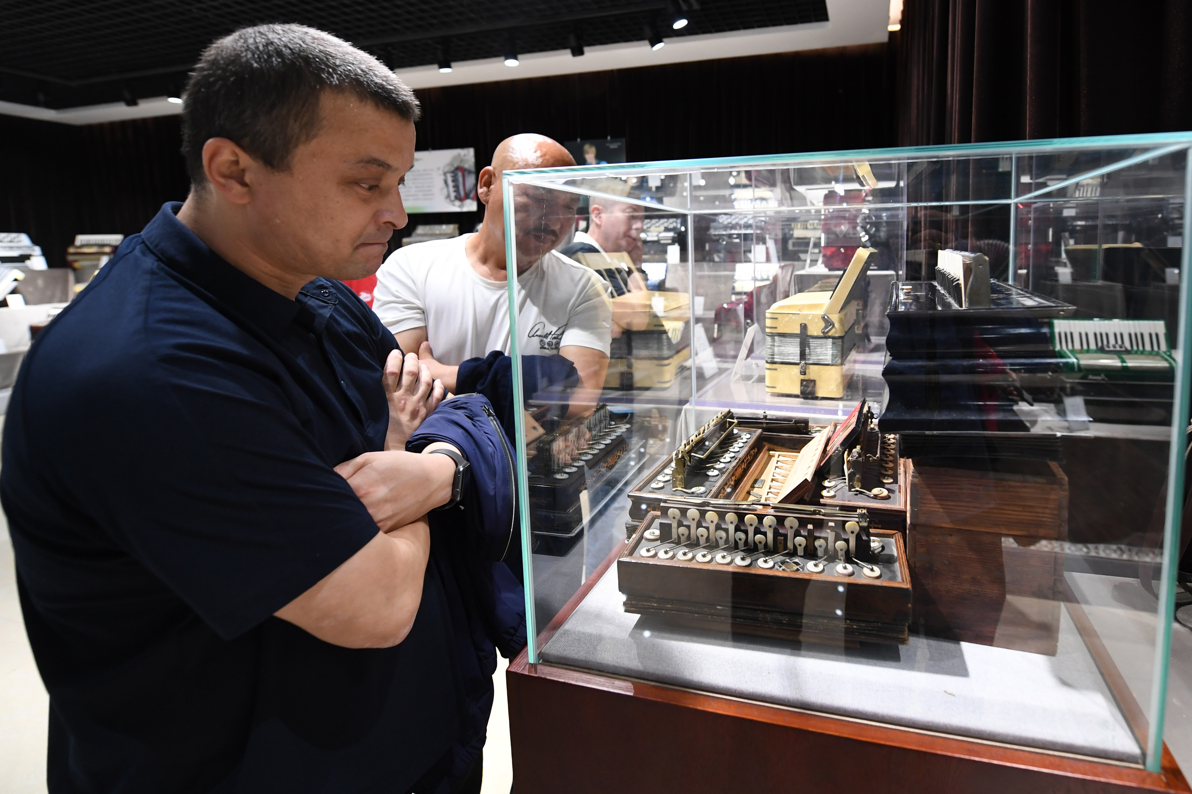 People watch a staff playing the accordion at the Tacheng accordion museum, Sept. 4, 2019. (Xinhua/Cheng Li)