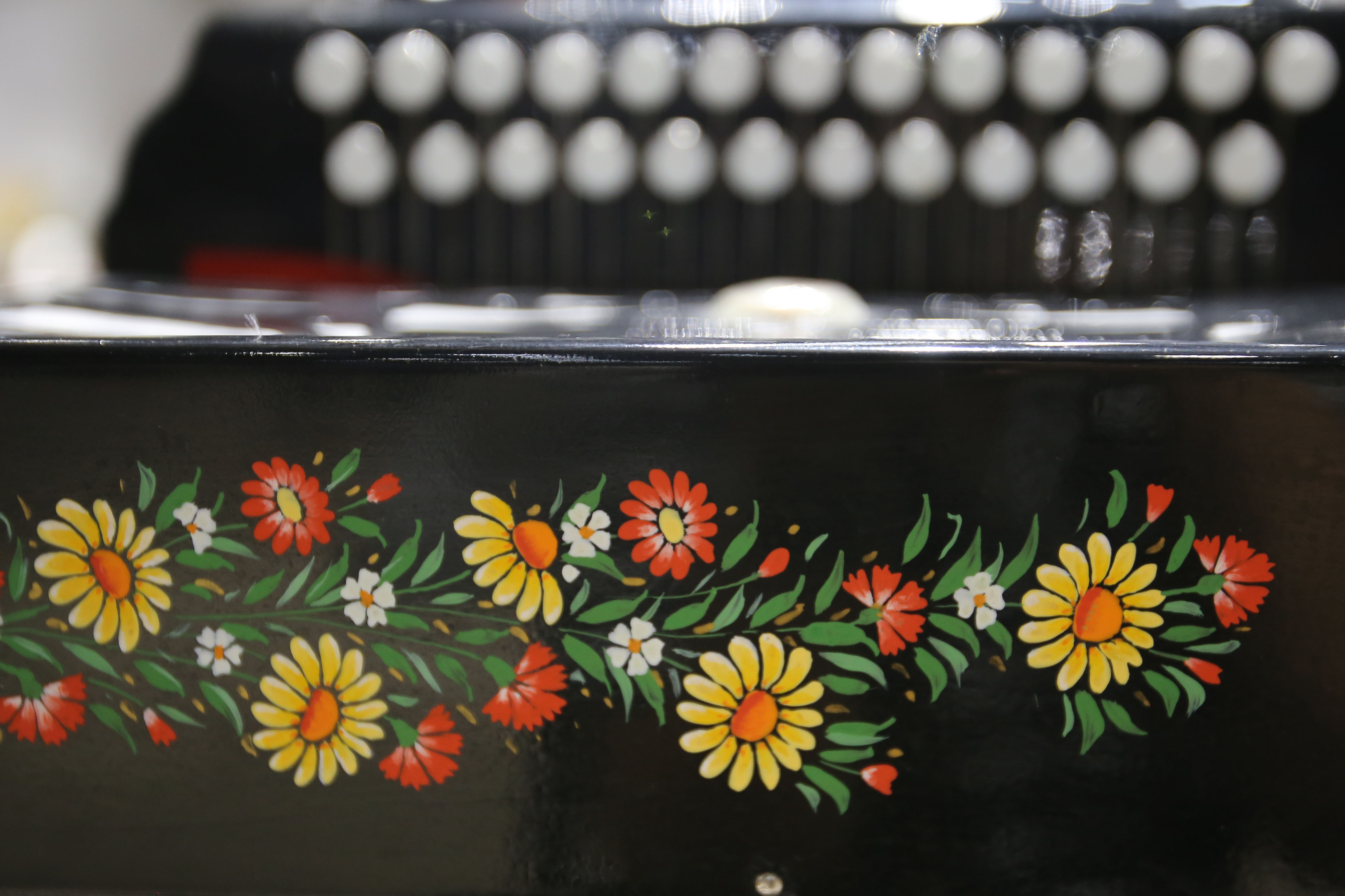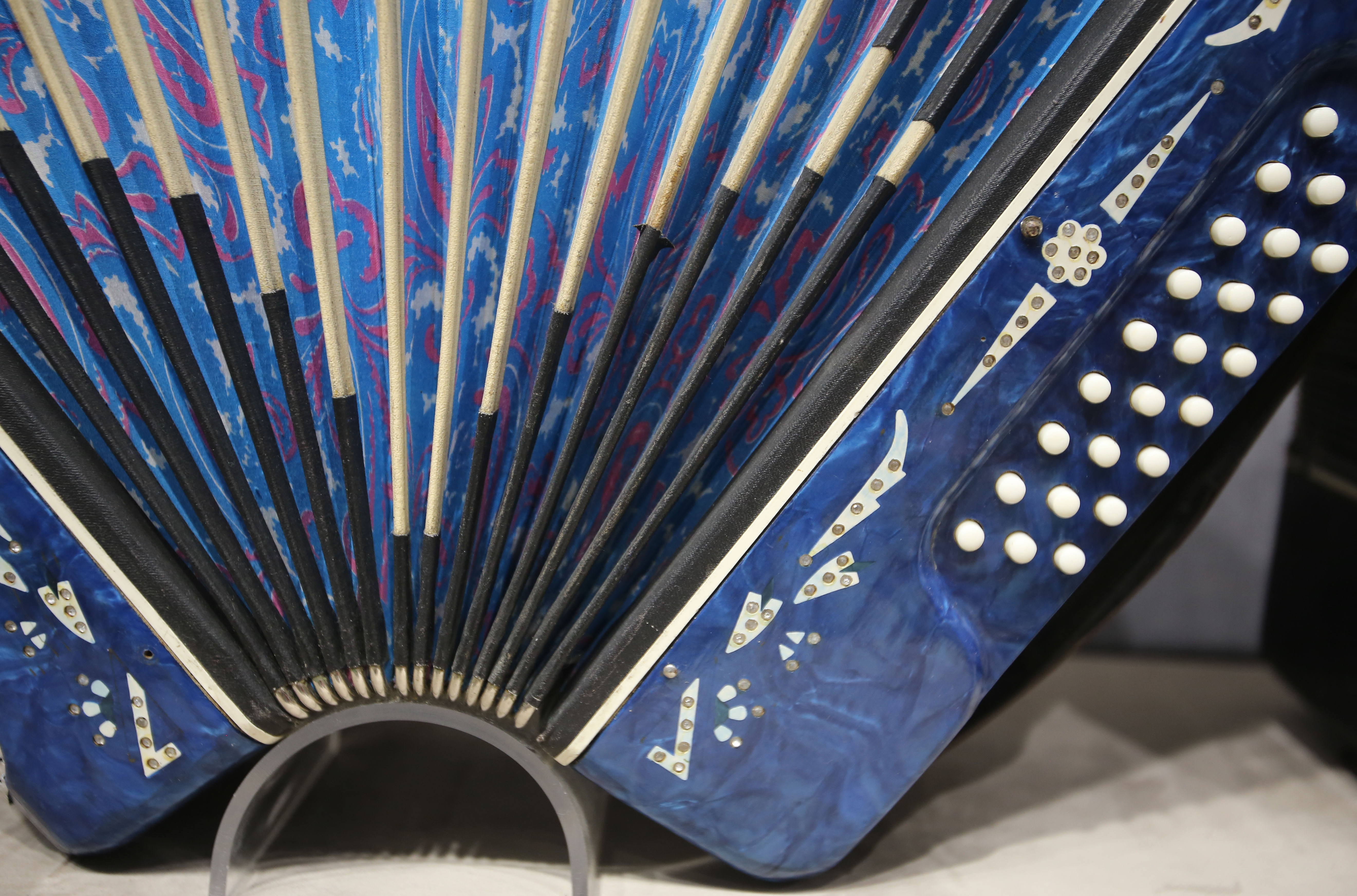 Photo taken on Sept. 4, 2019 shows detail of an accordion displayed at the Tacheng accordion museum. (Xinhua/An Xiya)