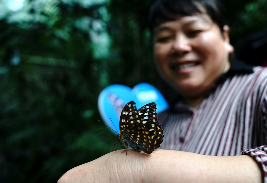 A visitor poses for a photo with a butterfly in Shanghai Zoo, east China's Shanghai, Oct. 2, 2019.(Xinhua/Zhang Jiansong)