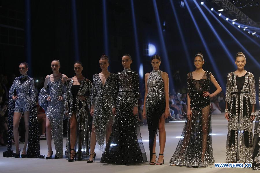 Models present creations by designer Yousef Al-jasmi during the "Designers & Brands" fashion show in Beirut, Lebanon, on Oct. 8, 2019. (Photo by Bilal Jawich/Xinhua)