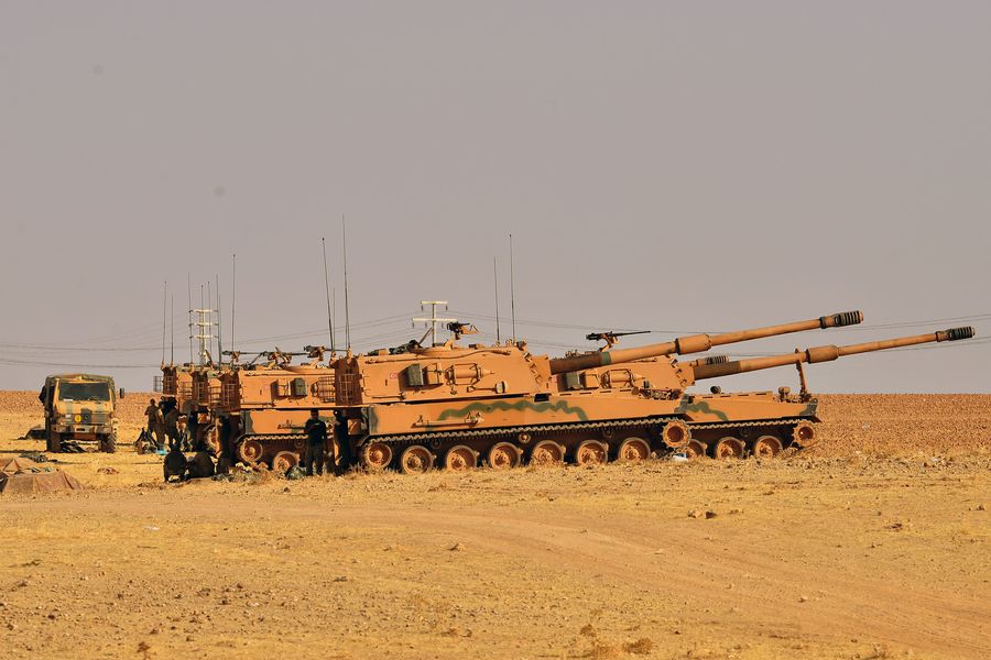 Photo taken on Oct. 13, 2019 from Turkey's Akcakale shows Turkish self-propelled artillery guns attacking Tal Abyad in northern Syria.(Photo by Mustafa Kaya/Xinhua)