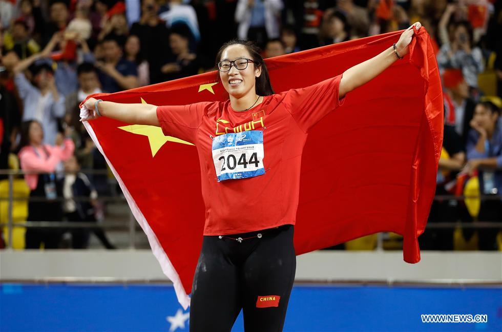 Feng Bin of China celebrates after the women's discus throw final of track and field at the 7th CISM Military World Games in Wuhan, capital of central China's Hubei Province, Oct. 24, 2019. (Xinhua/Wang Lili)
