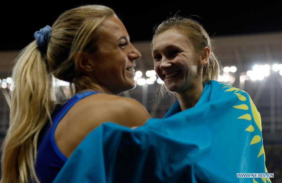 Olga Rypakova (R) of Kazakhstan celebrates with Ottavia Cestonaro of Italy after the women's triple jump final of track and field at the 7th CISM Military World Games in Wuhan, capital of central China's Hubei Province, Oct. 25, 2019. (Xinhua/Wang Lili)