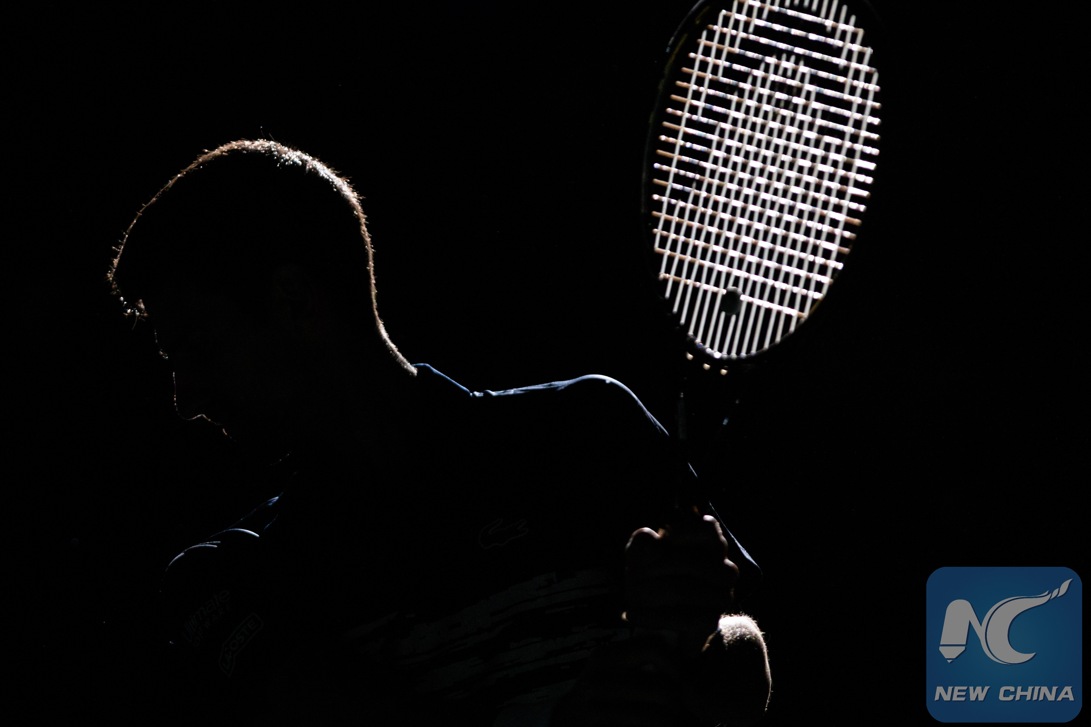 Novak Djokovic of Serbia warms up before the singles quarter-final match against Stefanos Tsitsipas of Greece at the Rolex Paris Masters 1000 held at the AccorHotels Arena in Paris, France, Nov. 1, 2019. (Photo by Aurelien Morissard/Xinhua)