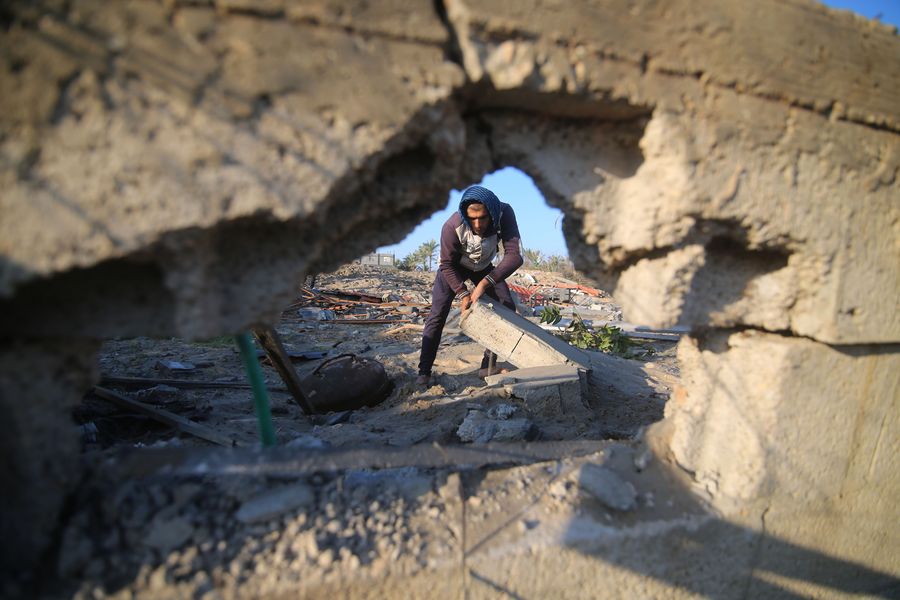 A Palestinian inspects the rubbles following an Israeli airstrike, in the southern Gaza Strip city of Khan Younis, Nov. 2, 2019. (Xinhua/Khaled Omar)