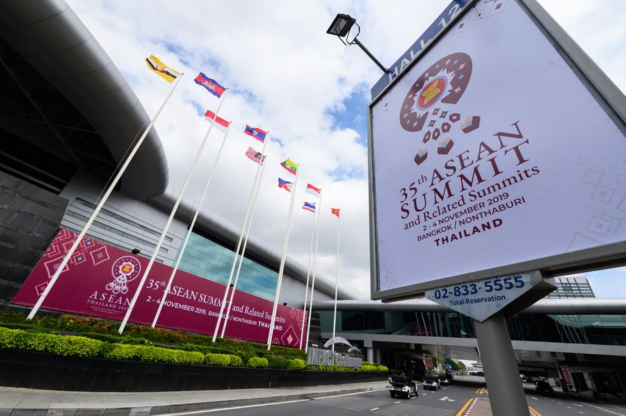 Photo taken on Nov. 1, 2019 shows a view of the meeting venue of the 35th ASEAN summit and related summits in Bangkok, Thailand. The 35th ASEAN summit and related summits are scheduled for Nov. 2 to 4 in Bangkok. (Xinhua/Zhu Wei)