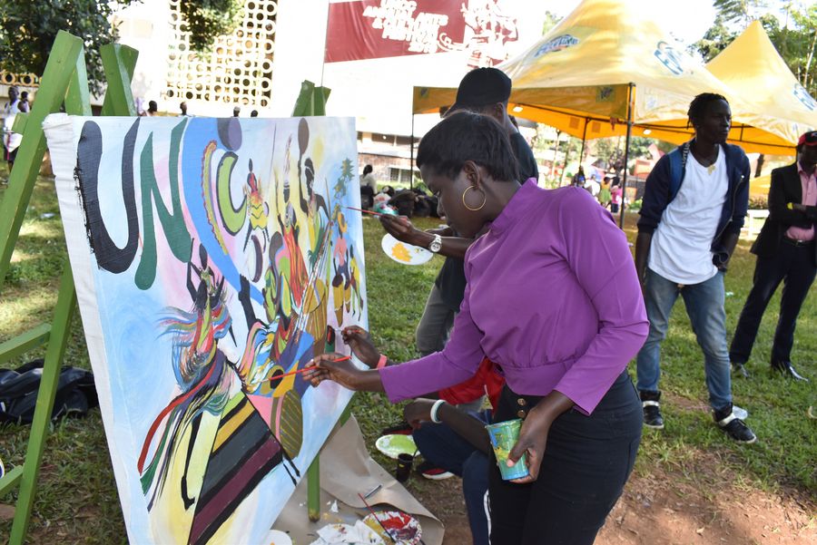 Visitors paint at the Art exhibition center during the 2019 Uganda National Cultural Centre annual art and culture festival in Kampala, capital of Uganda, Nov. 3, 2019. (Xinhua/Nicholas Kajoba)