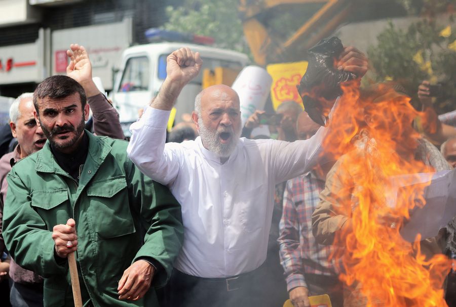 People take part in a protest to condemn U.S. withdrawal from the 2015 Iran nuclear deal in Tehran, Iran, on May 11, 2018. Thousands of people marched on the streets in Tehran on Friday chanting anti-U.S. slogans. (Xinhua/Ahmad Halabisaz)