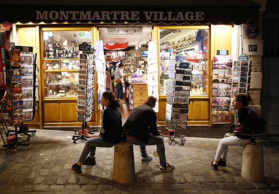 People visit a souvenir shop in Montmartre of Paris, France, Aug. 14, 2019. Located in the north of Paris, Montmartre is famous for its beautiful scenery, unique architecture and rich artistic atmosphere. (Xinhua/Gao Jing)