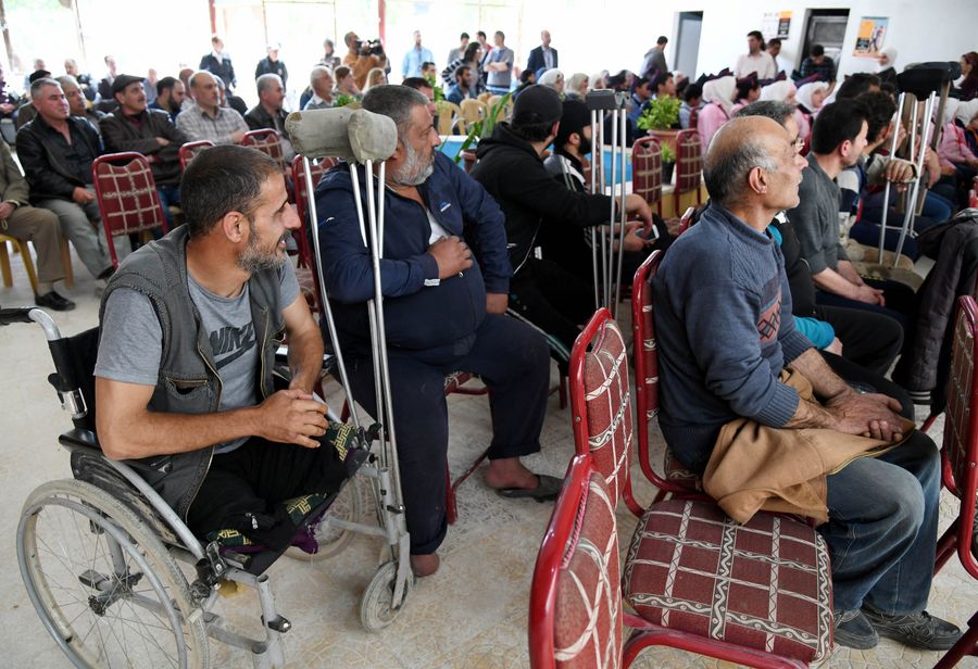 Wounded Syrians attend an awareness session about the danger of the conflict leftovers such as land mines in Damascus, capital of Syria, on April 25, 2019. (Xinhua/Ammar Safarjalani)
