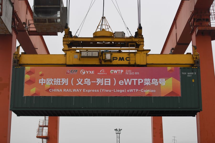 One of the containers on the China Railway Express (Yiwu-Liege) eWTP-Cainiao, a new China-Europe freight train service, is lifted by a gantry crane at Yiwu West Railway Station in Yiwu, east China's Zhejiang Province, Oct. 9, 2019. (Xinhua/Huang Zongzhi)